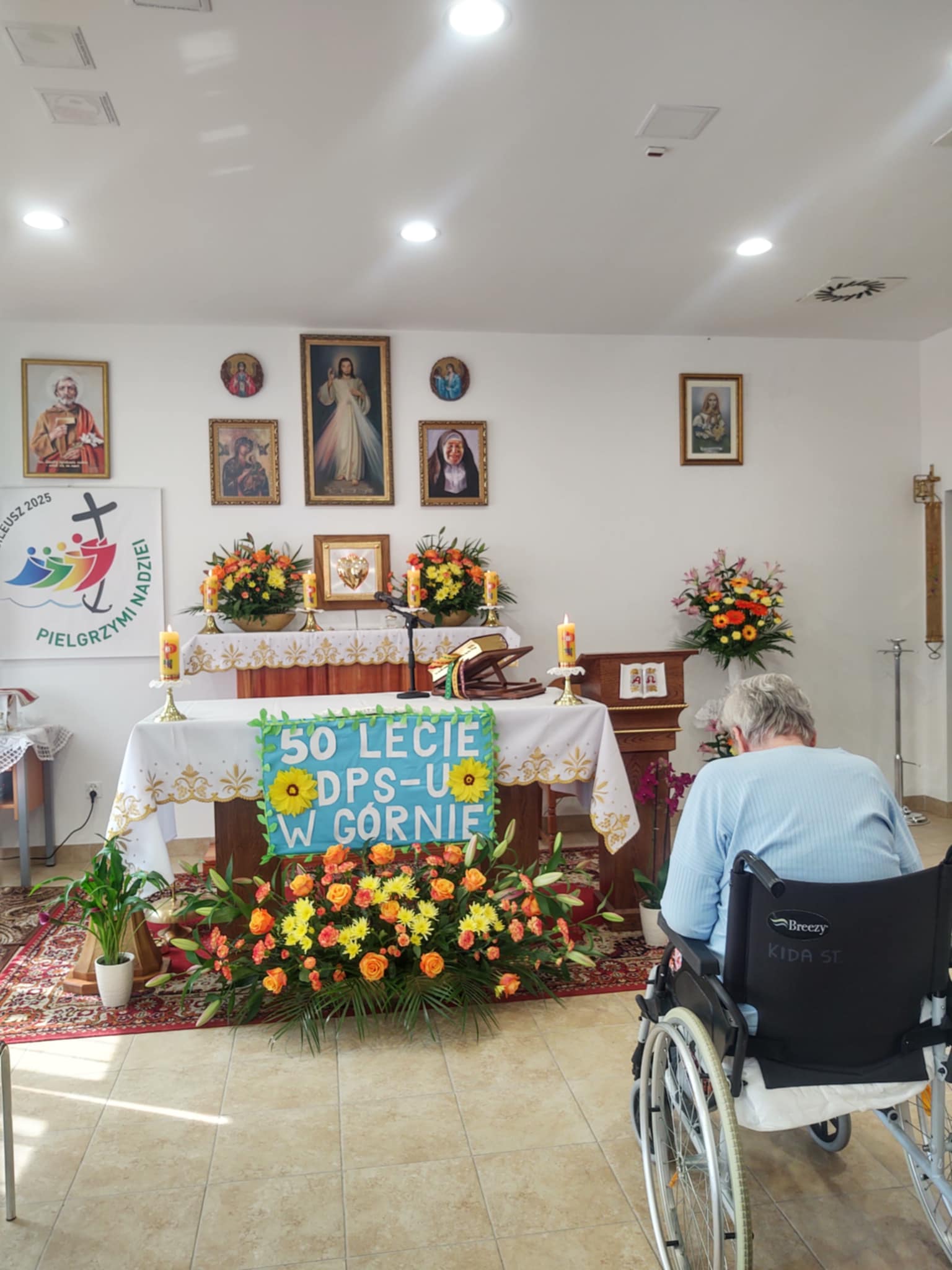 Obchody rozpoczęła dziękczynna msza święta sprawowana przez naszego kapelana, ks. kanonika Piotra Irzyka. Po uroczystej mszy i powitaniu zebranych, nasi honorowi goście otrzymali symboliczne upominki – portrety rysowane ołówkiem przez jednego z bardzo uzdolnionych mieszkańców oraz wykonane podczas terapii zajęciowej drewniane krążki z datą Jubileuszu. Nie zabrakło oczywiście części artystycznej przygotowanej wspólnie przez mieszkańców i pracowników domu. Kilka miesięcy pracy zaowocowało wiązanką piosenek z ostatnich pięćdziesięciu lat. Żeby nasi goście i pracownicy nie nudzili się zanadto, ich zadaniem było odgadnięcie tytułów utworów, nazwisk wykonawców i dziesięciolecia, w którym dany utwór powstał. Na mieszkańców również czekała niespodzianka. Przygotowane przez nich dekoracyjne „pięćdziesiątki” były jednocześnie losami na loterii. Niespodzianek więc nie zabrakło.