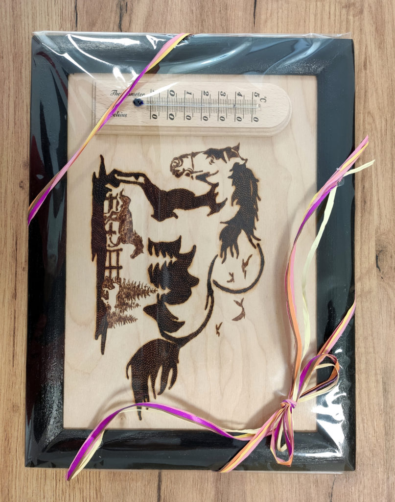 Nie zabrakło też pamiątki w postaci wspaniałego obrazka wykonanego techniką pirografii przez jedną z mieszkanek DPS w Lubzinie, a przedstawiającego – jakżeby inaczej – sylwetkę konia.