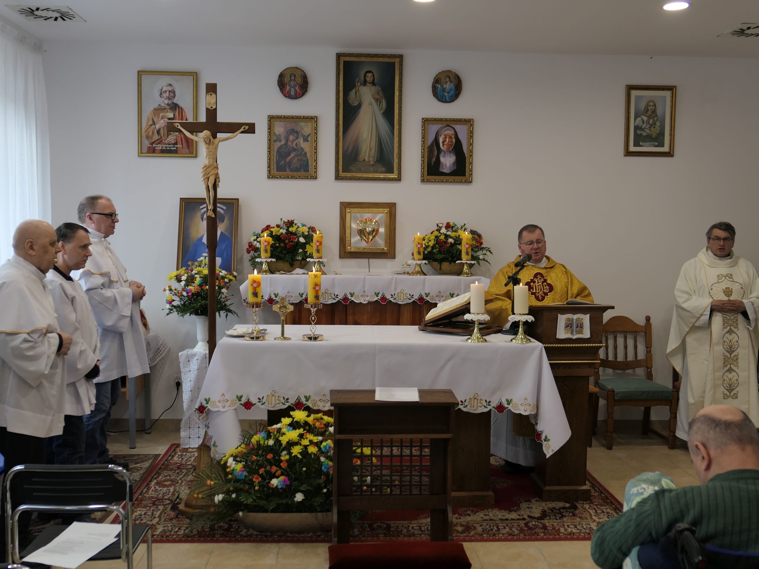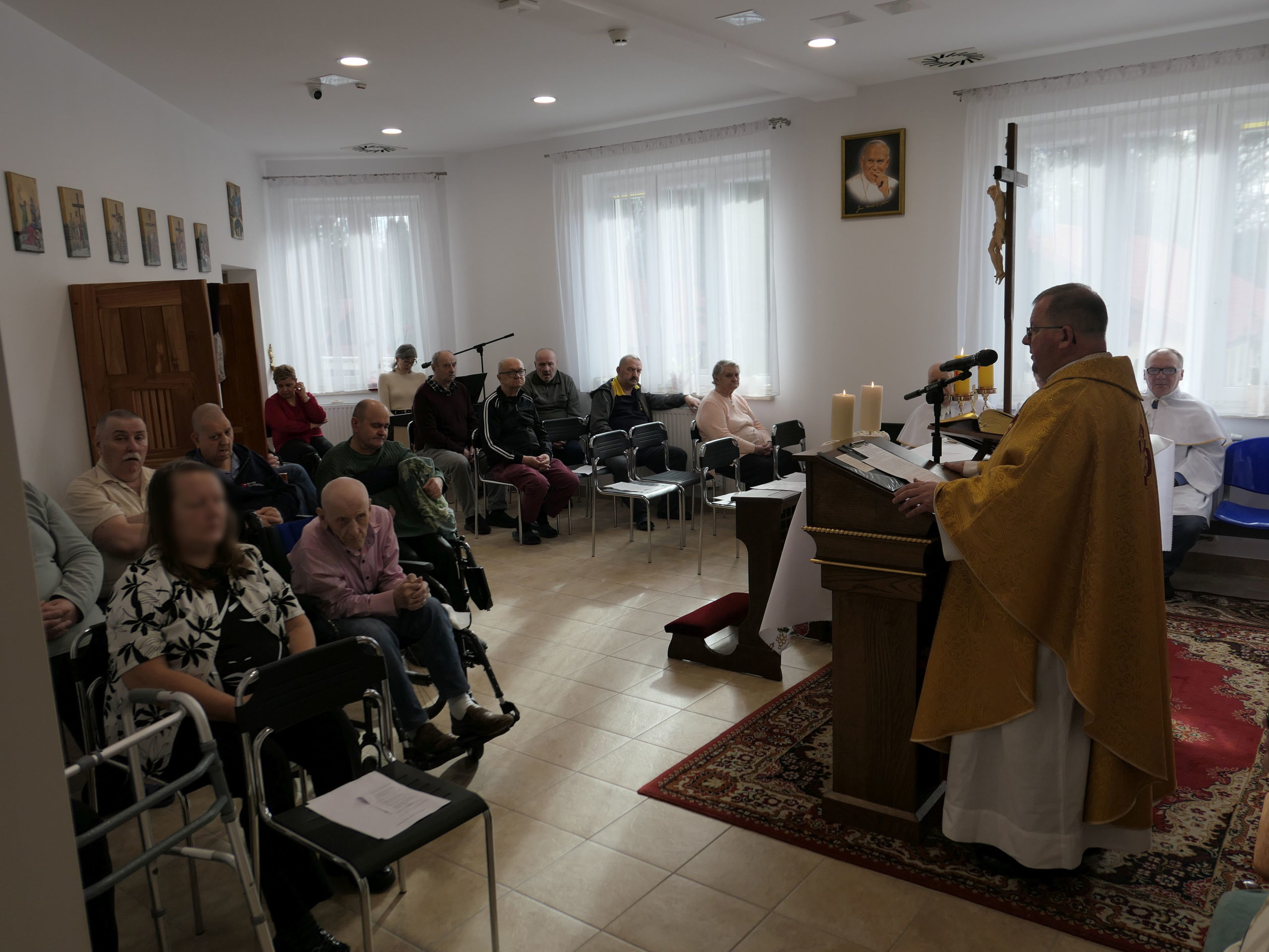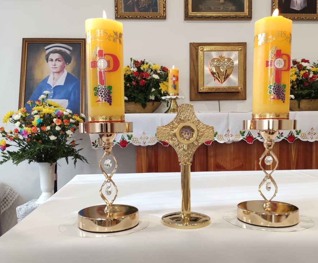 Tegoroczne obchody Światowego Dnia Chorego w naszym domu zostały nieco przesunięte i odbyły się dopiero 13 lutego. Przewodniczył im ks. kanonik Tomasz Kozicki – proboszcz parafii Górno i dziekan dekanatu Sokołów Małopolski. Wraz z naszym kapelanem – ks. Piotrem Irzykiem – udzielili sakramentu namaszczenia chorych mieszkańcom domu, którzy uczestniczyli w uroczystościach. Natomiast po zakończonej mszy świętej, wszyscy otrzymali błogosławieństwo relikwiami bł. Hanny Chrzanowskiej. To właśnie z racji peregrynacji relikwii bł. Hanny obchody Dnia Chorego w naszym domu zostały przesunięte o dwa dni. Postać tej błogosławionej tak bardzo oddanej pracy na rzecz chorych powinna być szczególnie bliska wszystkim, którzy jak ona pracują w służbie chorym i cierpiącym. Jej życiorys jest jednak zbyt bogaty, by przedstawić go w krótkiej formie relacji z wydarzenia. Warto jednak odwiedzić stronę poświęconą tej wielkiej, aczkolwiek mało znanej postaci znajdującą się pod adresem: https://hannachrzanowska.pl/zyciorys/